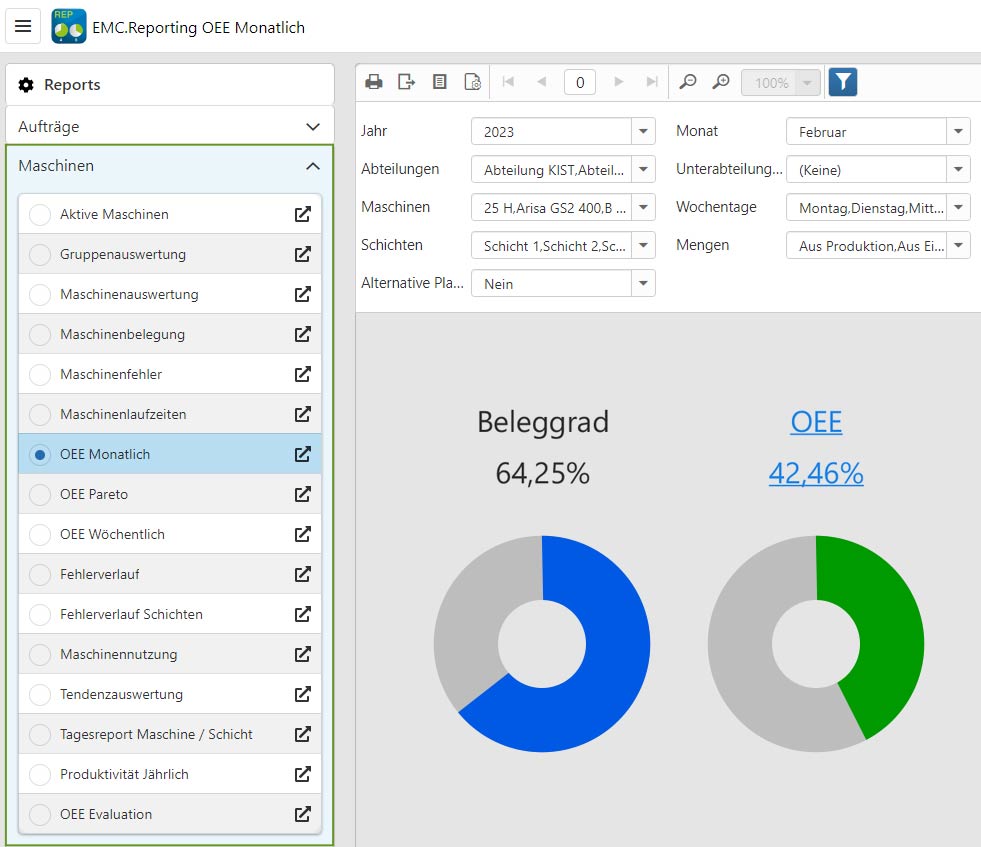 EMC Reporting macht die gesammelten Produktionsdaten und Prozesskennzahlen für den operativen Kurzfristbereich zur unmittelbaren Sicherung der Produktion übersichtlich verfügbar. Dazu zählen auch Analysen für den strategischen Langfristbereich zur Bewertung der Wirksamkeit von getroffenen Entscheidungen. Risiken und Potentiale werden mit wichtigen Analysen wie OEE von Anlagen, Rüstgrade, Stillstandszeiten von Anlagen, Plan-Ist-Zeit-Analyse der Artikel oder Produktivitätskennzahlen schnell erkannt. Das Reporting Basismodul unserer MES-Software EMC ermöglicht so eine ehrliche Leistungsanalyse und Prozessoptimierung der Produktion auf Basis fundierter Maschinen- und Produktionsdaten. Alles mit dem Ziel, die Effizienz der Produktion zu steigern.