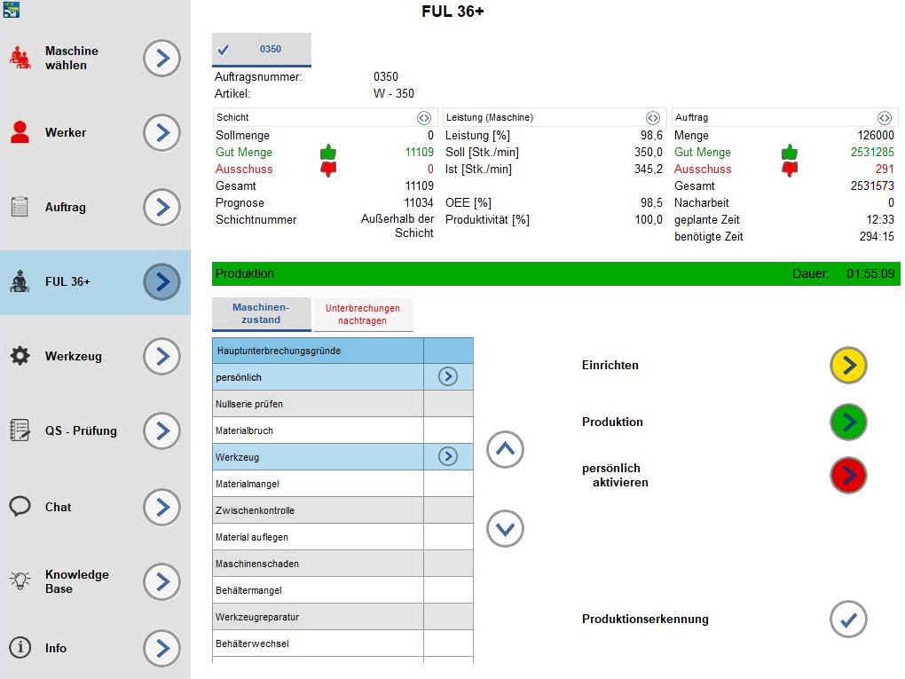 Alle relevanten auftrags-, artikel- und personenbezogene Daten werden so in Echtzeit lückenlos mit der BDE erfasst und an das ERP System zurückgemeldet. Zusätzlich lassen sich so auch zuverlässig Betriebsdaten zum Beispiel bei Montage oder an Handarbeitsplätzen komplett ohne Maschinendaten spielend erfassen.