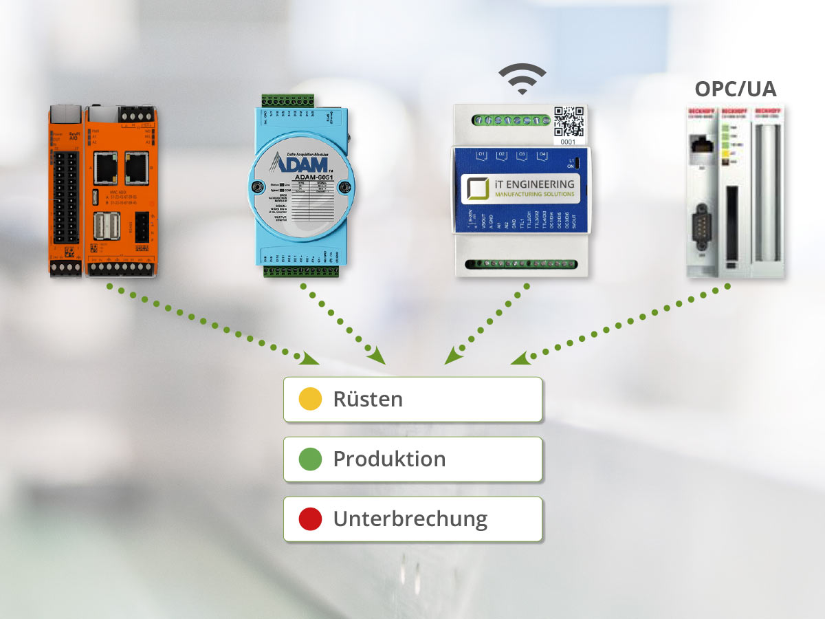 Die Erfassung von Daten bei älteren Maschinen erfolgt über 24V Signale. Dafür werden IoT-Gateways als Hardware für die Erfassung eingesetzt. Bei neueren Maschinen erfolgt die Maschinendatenerfassung über die Industrie 4.0 Schnittstelle OPC/UA.
