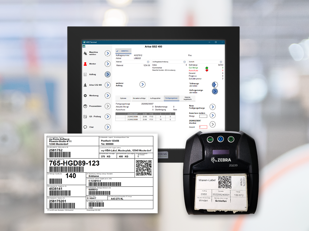 Warenbegleitschein direkt an der Maschine ausdrucken, händisch oder automatisch durch die Maschine oder einen Behälterwechsler. Die Mengen werden von der Maschinendatenerfassung übernommen.