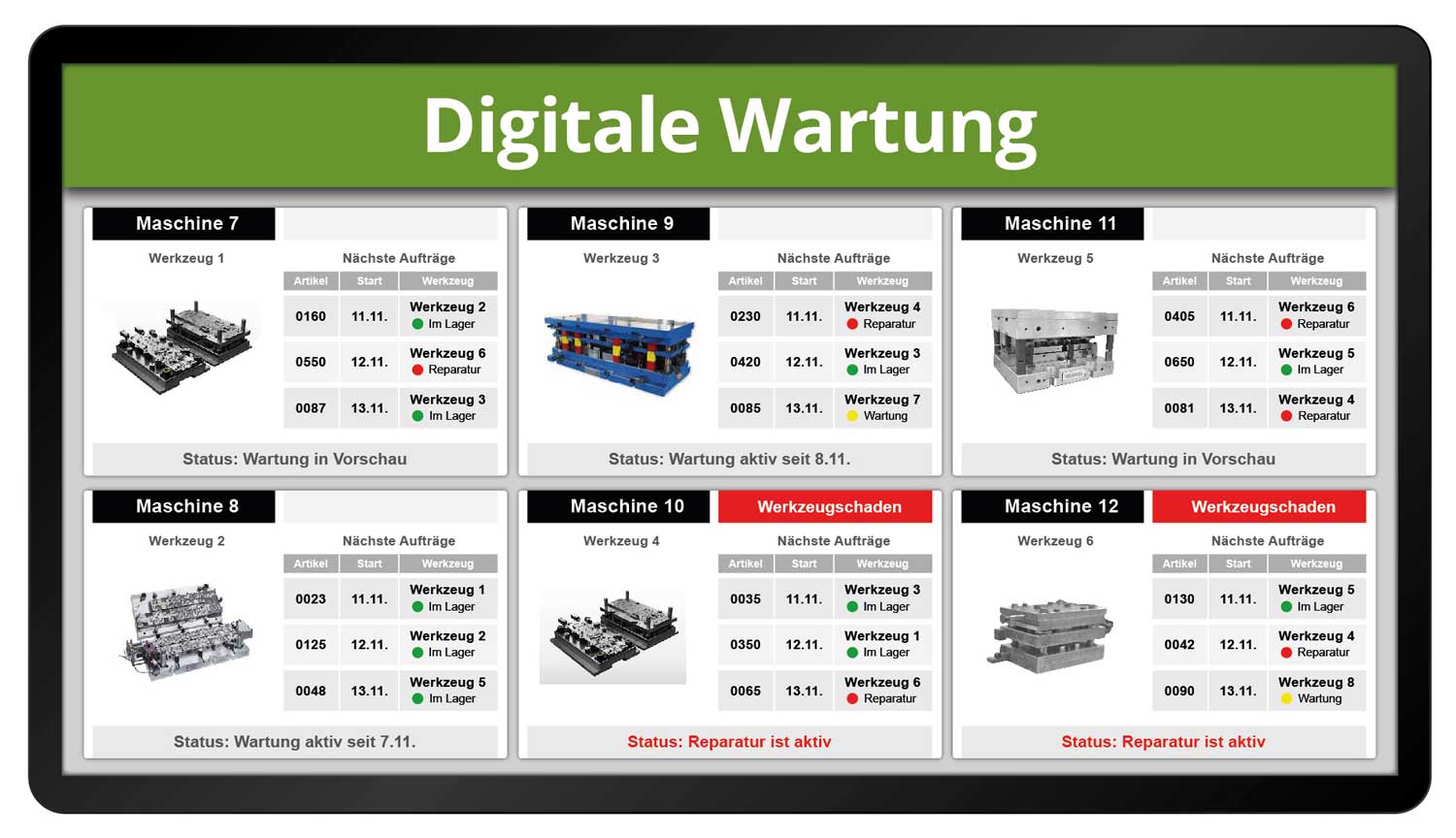 Mit der digitalen Wartung hat der Werkzeugbau jederzeit einen umfassenden Blick über alle Werkzeuge. Welches Werkzeug wird aktuell gewartet? Welches Werkzeug wird für den nächsten Auftrag benötigt?